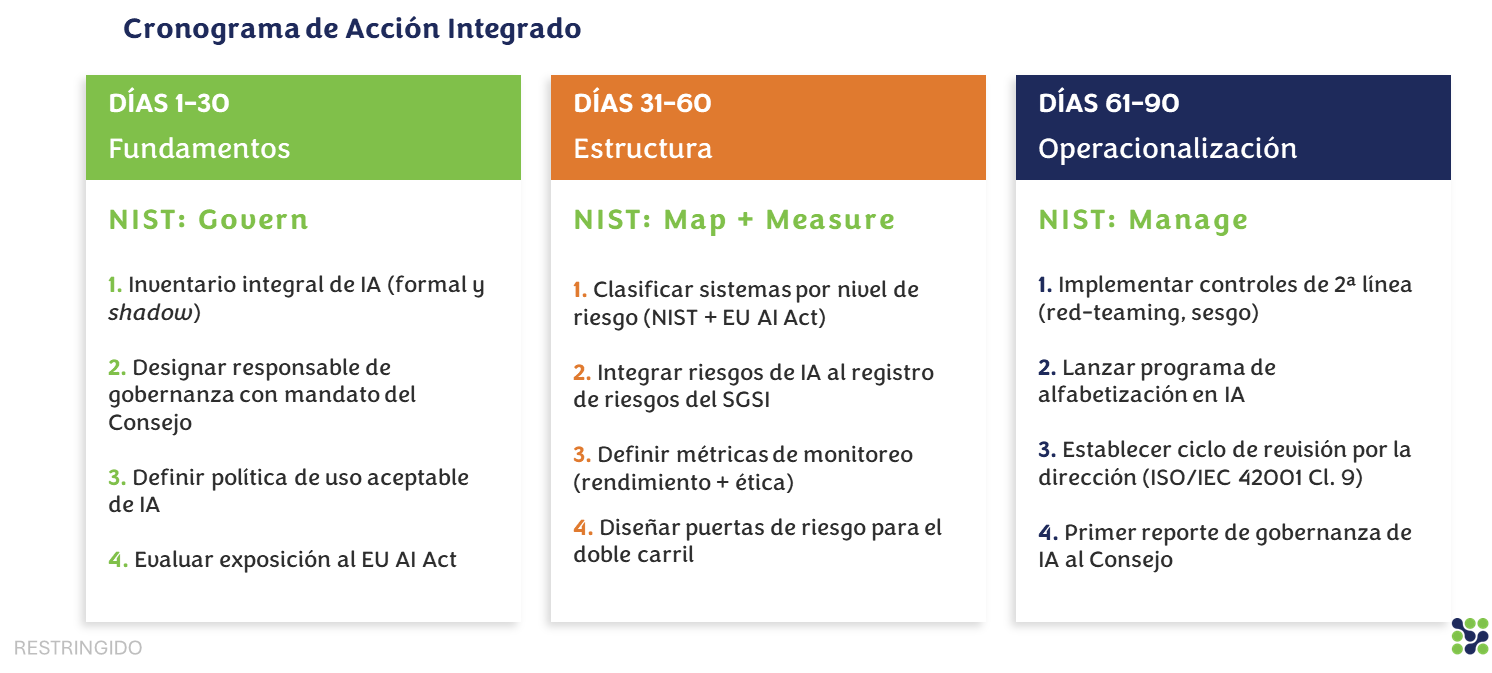- Días 61–90 (Operacionalización): Lanzar programas de alfabetización en IA para líderes y establecer el primer reporte de gobernanza ante el Consejo.